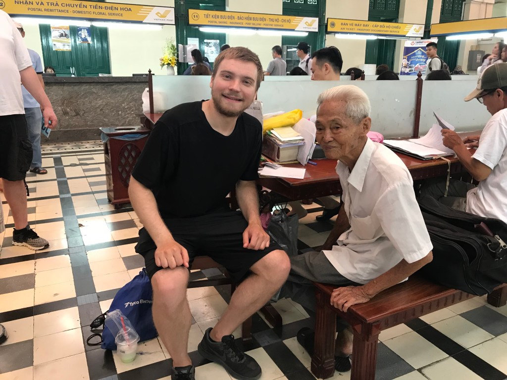 The highlight here was meeting Duong Van Ngo, a public writer for nearly 30 years (James said 60 years). He sits behind a sign that says “Information and Writing Assistance” and his job is to translate and write letters for people. Despite being in his late 80s, Mr. Ngo is on top of his game: he told me that he rides his bike to work every single day! He was a really friendly guy and signed a few postcards for me.